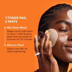Biodegradable. daily toner pads concentrated with Vitamin C + Green Tea Enzyme to help brighten skin & fade dark spots like post-breakout marks + sun spots.