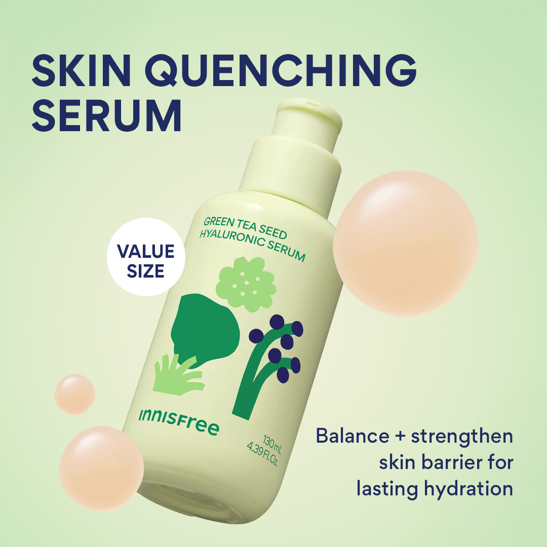 A daily hydrating serum with a skin-quenching formula infused with Green Tea and encapsulated hyaluronic acid that helps balance while strengthening the skin barrier for lasting hydration and glow.