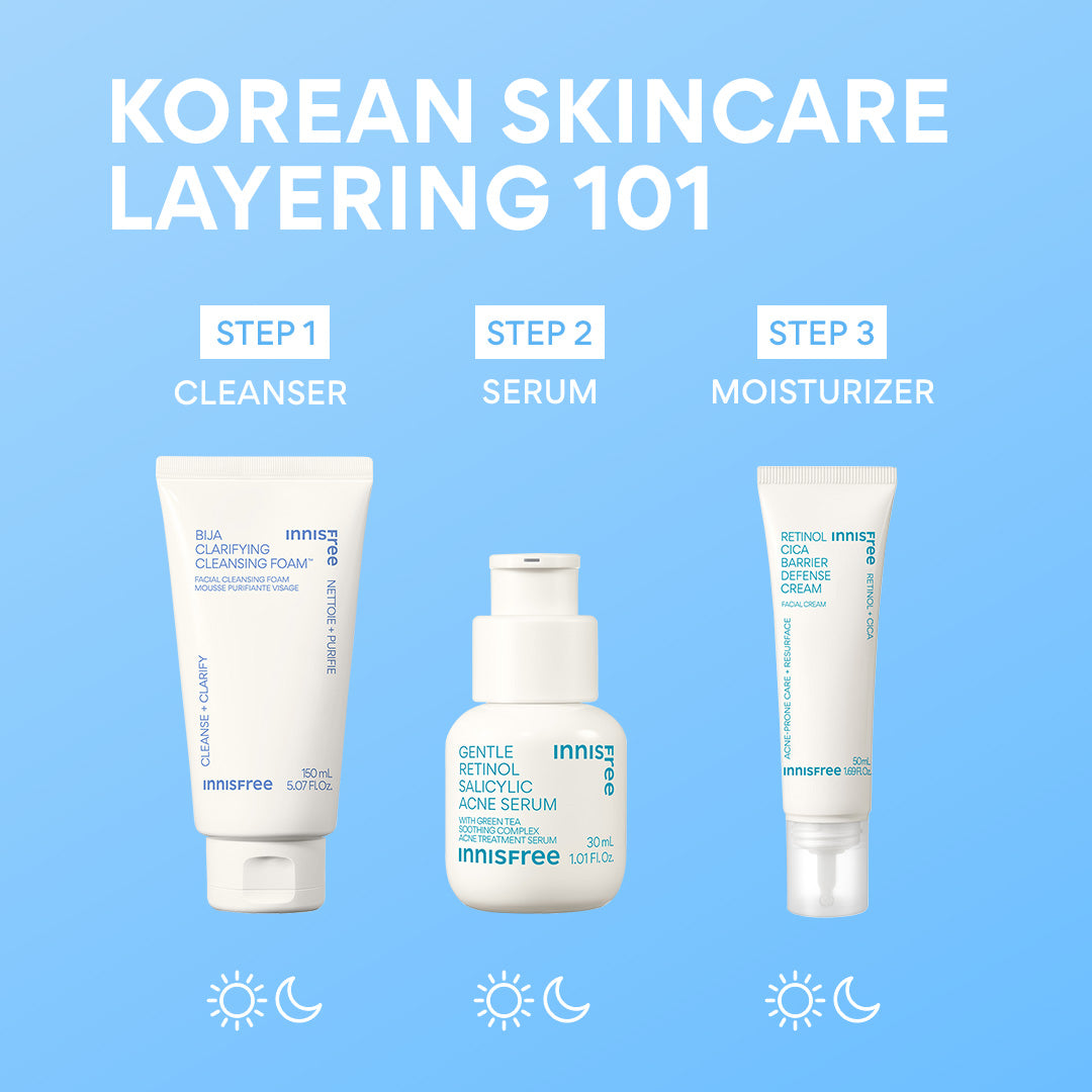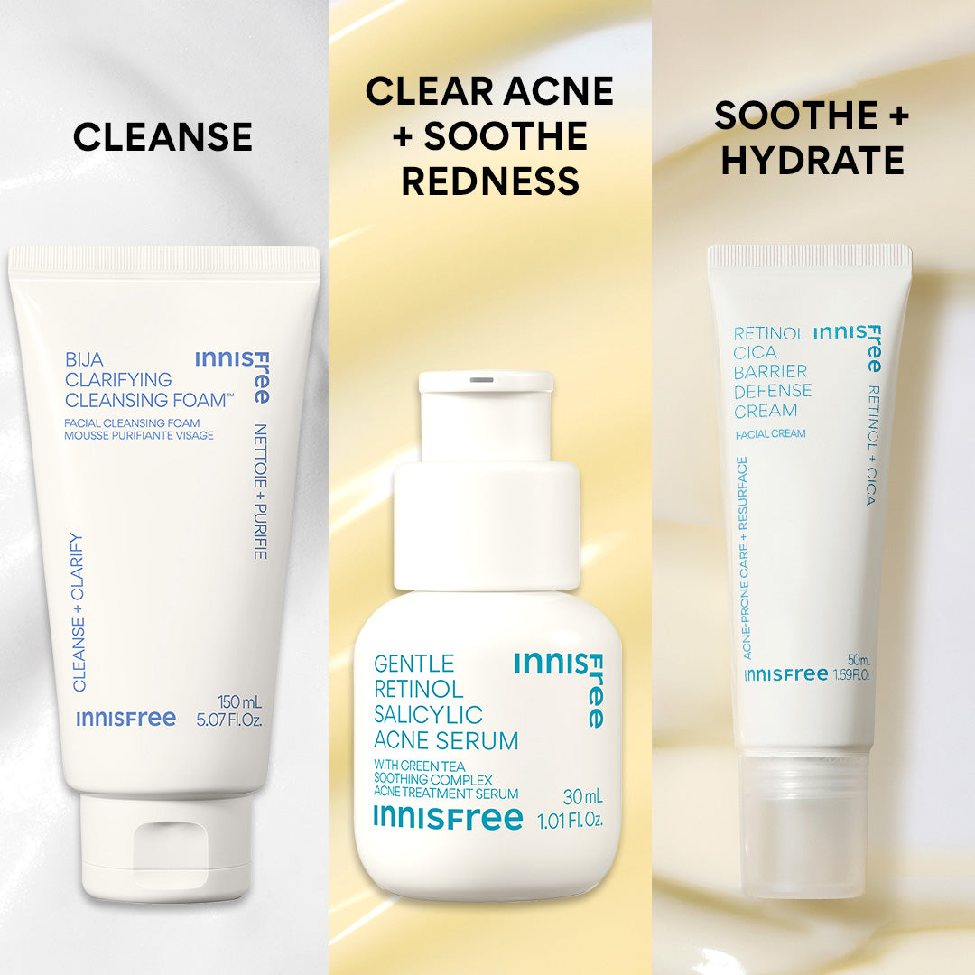 Say hello to your new routine to target acne and soothe troubled skin. This routine set features full sizes of our Bija Clarifying Cleanser. Gentle Retinol Acne Serum. and Retinol Cica Barrier Defense Cream??plus a free deluxe Green Tea Enzyme PHA Toner to help smooth your skin. Clear + soothed skin? Coming right up.